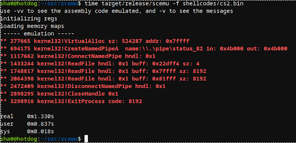 target/release/scemu -f shellcodes/rshell_sgn.bin -vv -c 44000 -l